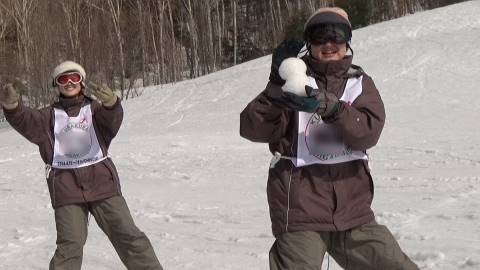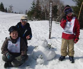 途中休憩で作った雪だるまを持って滑る子もいました。