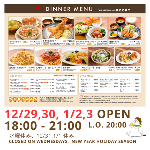 12月29,30日 1月2,3日カフェ&レストラン ロッキー夜営業します!